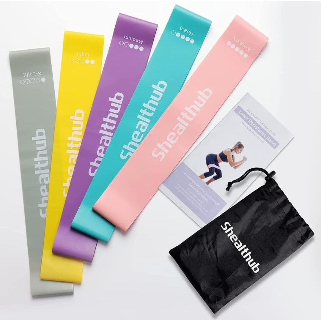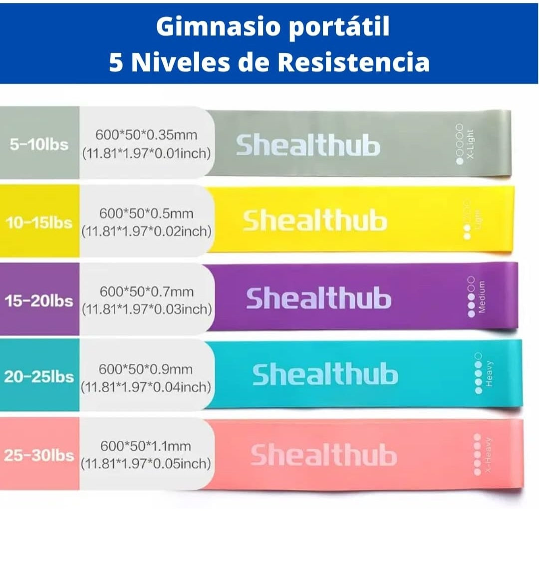 5 Bandas elásticas con 5 niveles de resistencia, incluye bolsa de almacenaje.